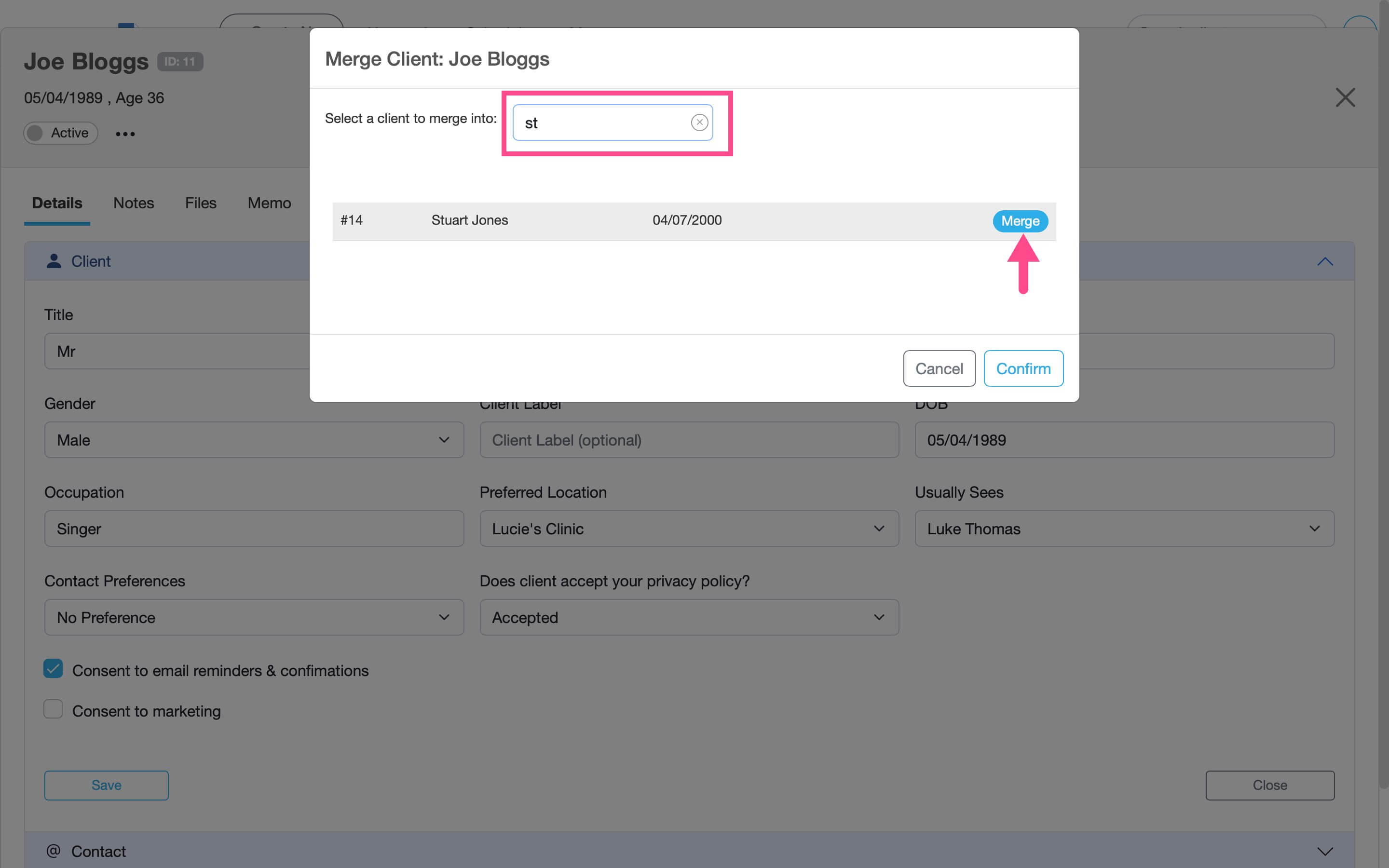 Now find the client you want to merge into; start typing into the search field to search for clients then click the "Merge" button.