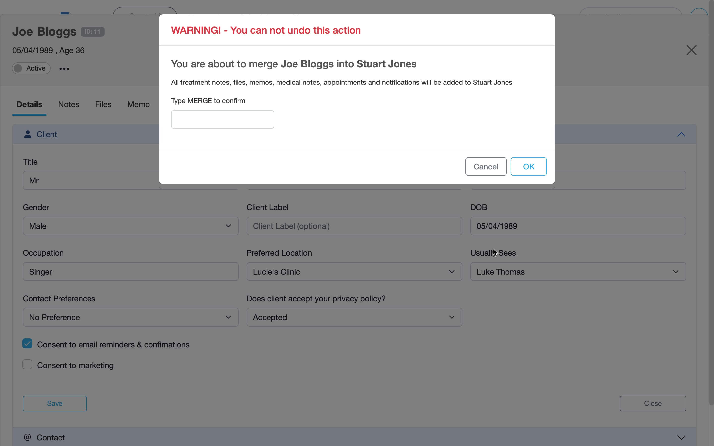 Finally check the details are correct then type "MERGE" into the confirmation field. Click "OK" to proceed with the merge.