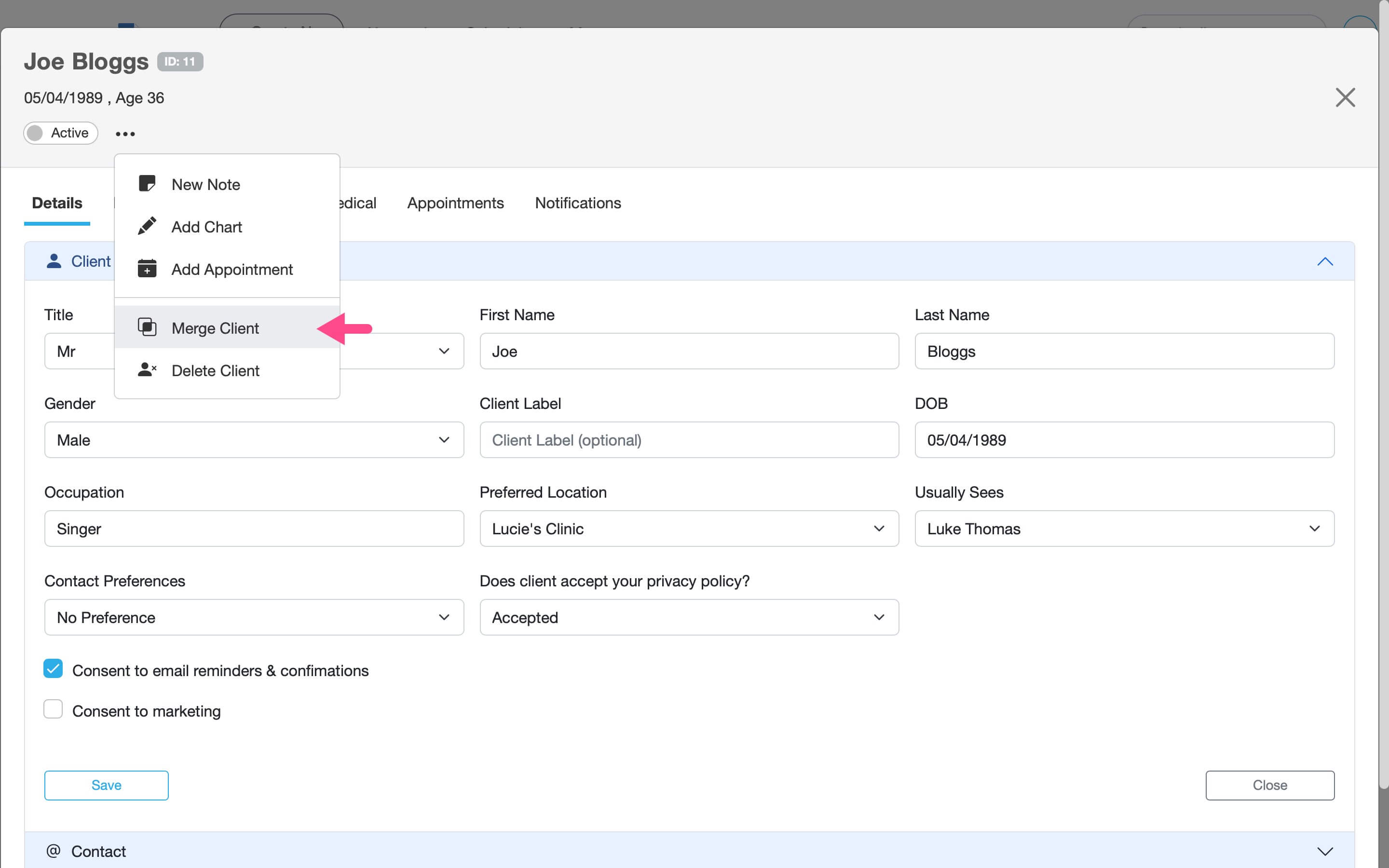 If you've created a duplicate copy of a client by mistake, it may be helpful to merge the data with another client.